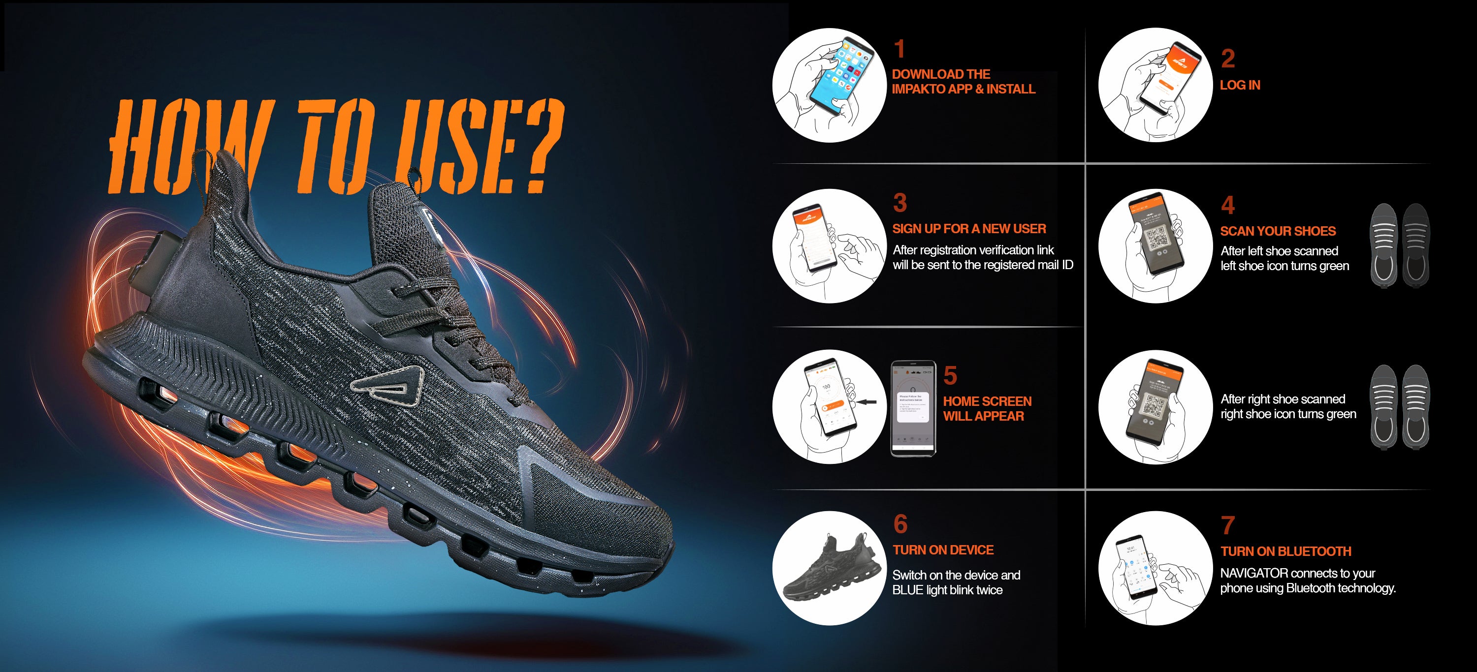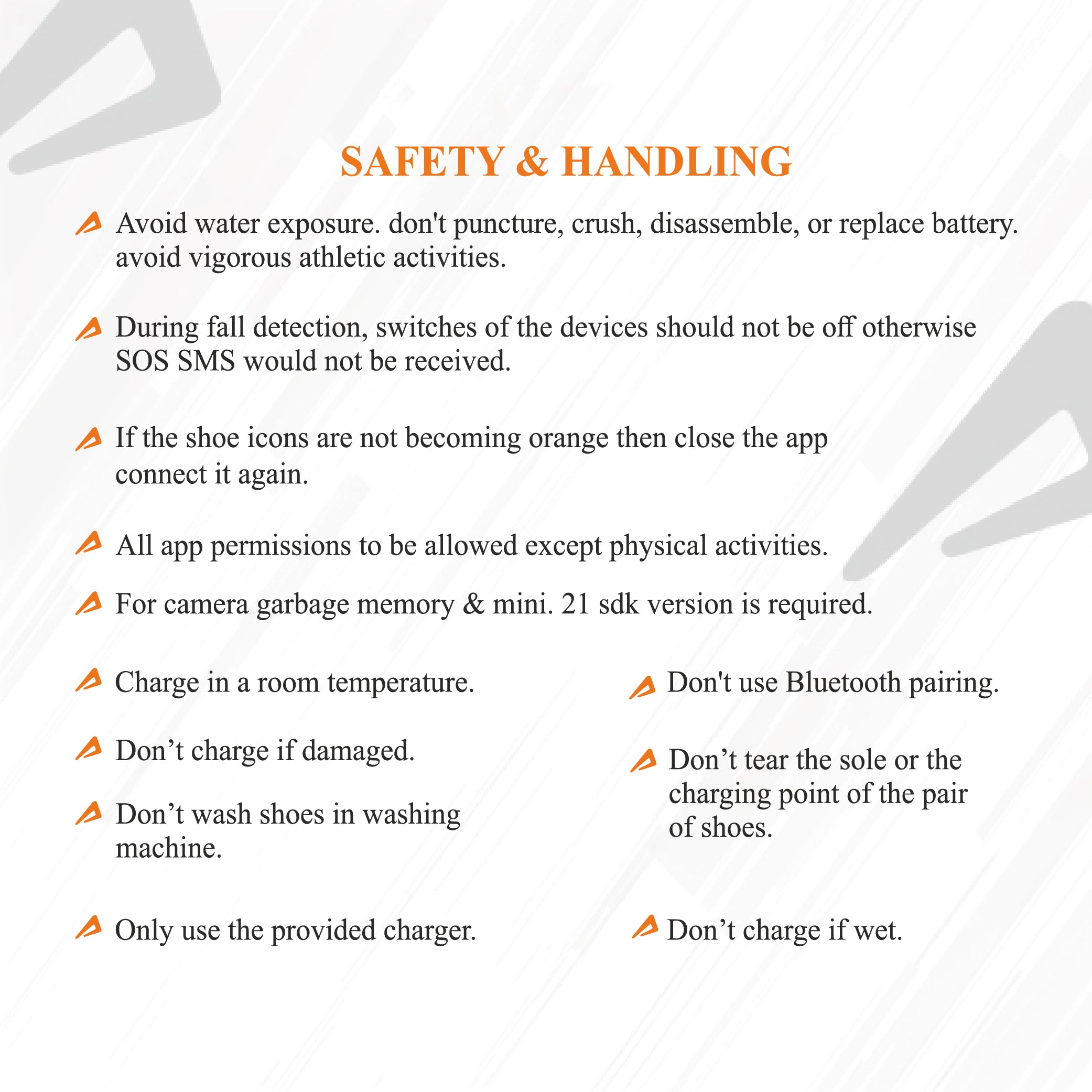 Impakto's features prioritise your safety. Avoid exposing the shoes to water, puncturing, crushing, disassembling, or replacing the battery, and refrain from vigorous athletic activities. Ensure the device switches are on for SOS SMS to be received. If the shoe icons do not turn orange, close the app and reconnect. With Impakto, you can trust in reliable fall detection technology and prioritize your safety every step of the way.