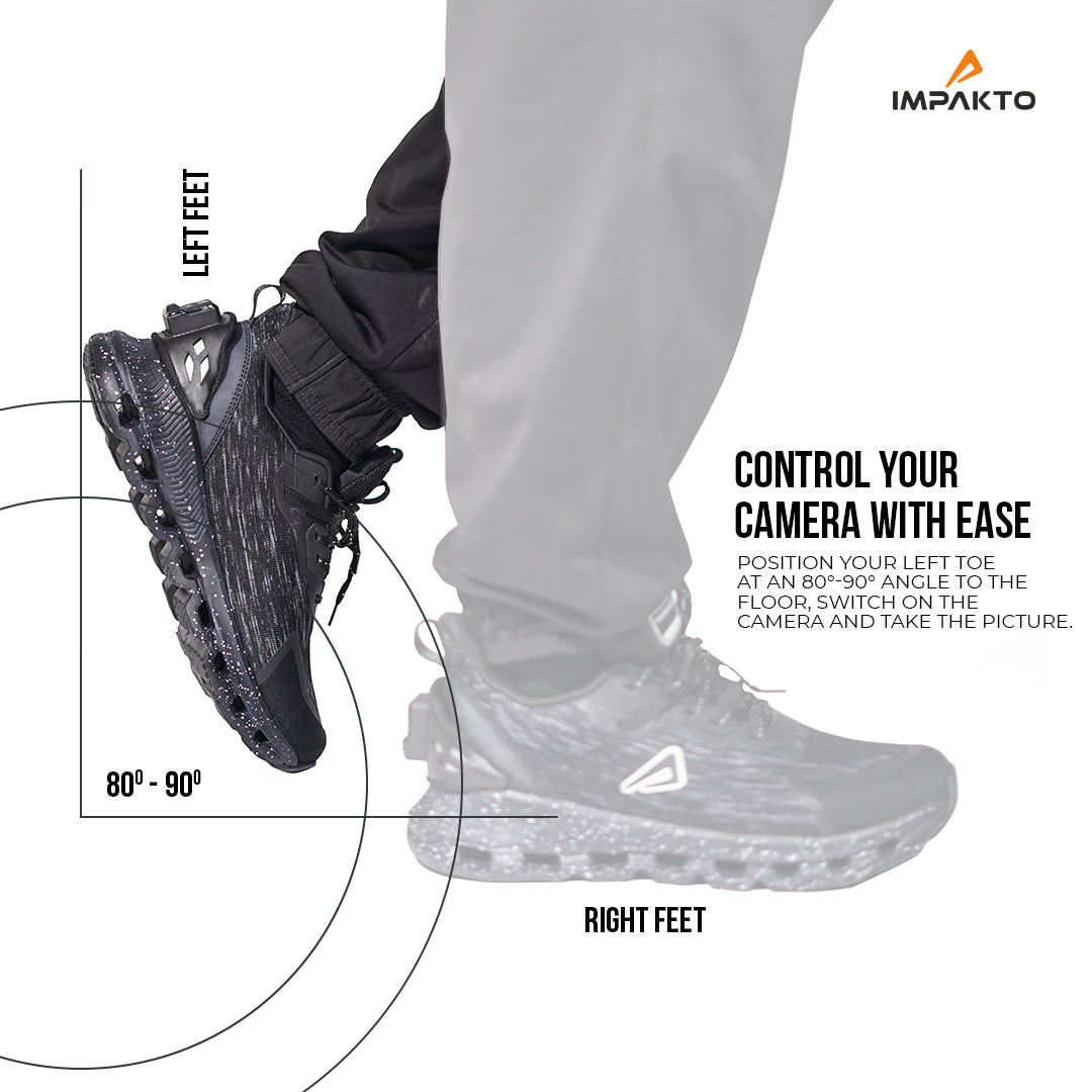 Discover Impakto's unique camera-controlling feature! First, put on your smart shoes. Position your left toe at an 80-90 degree angle to the floor. Open the Impakto app camera, and you're ready to capture the perfect shot. With Impakto, every step becomes an opportunity to create unforgettable memories. Our cutting-edge technology ensures your photos are always on point, making it easier than ever to share your adventures with friends and followers.