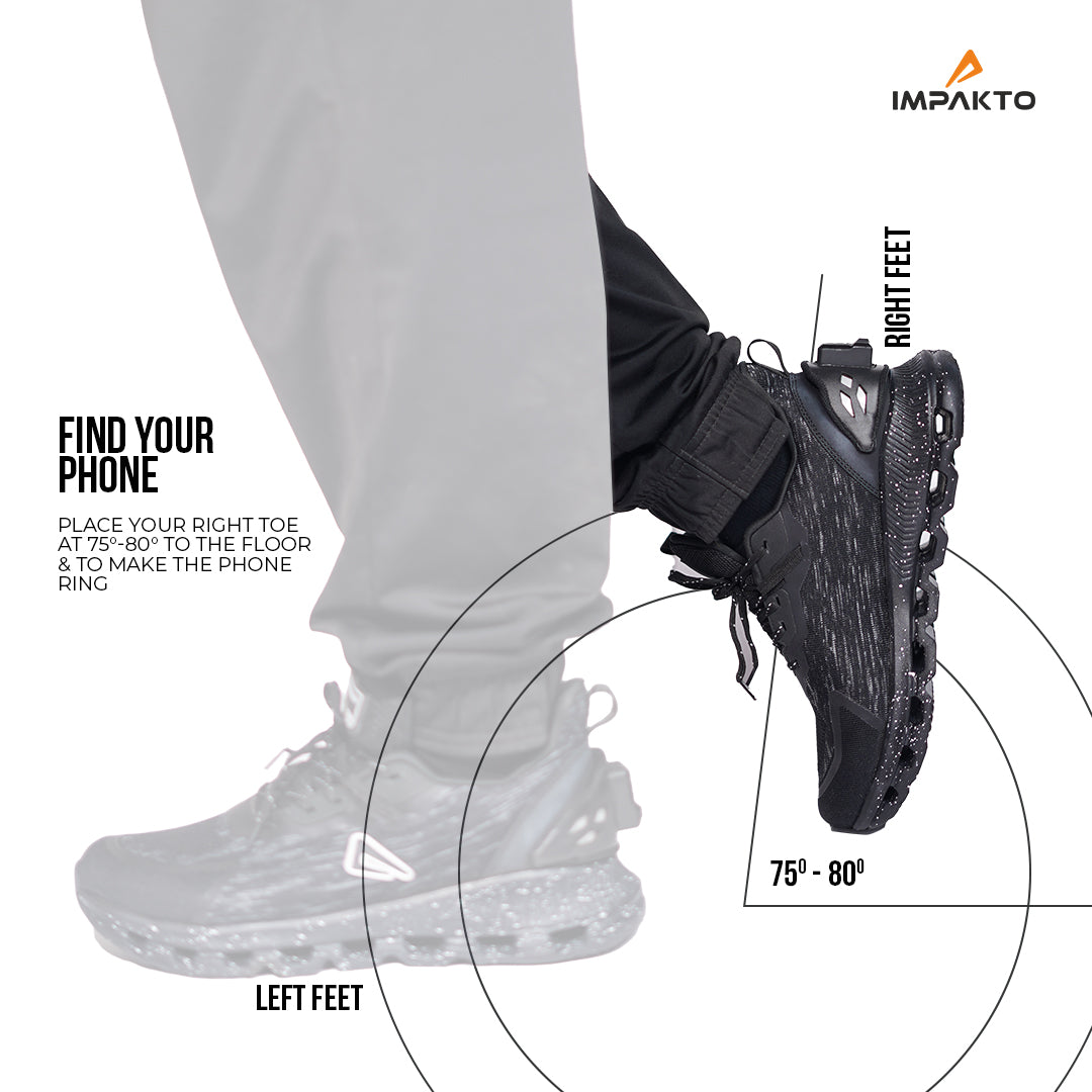 Navigating your phone has never been easier with Impakto smart shoes! Simply place your right toe at a 75-80 degree angle to the floor to make your phone ring. With Impakto, convenience is at your feet. Our innovative technology allows you to stay in control without even reaching for your phone. Embrace the future of smart footwear and enjoy seamless interactions with your devices.