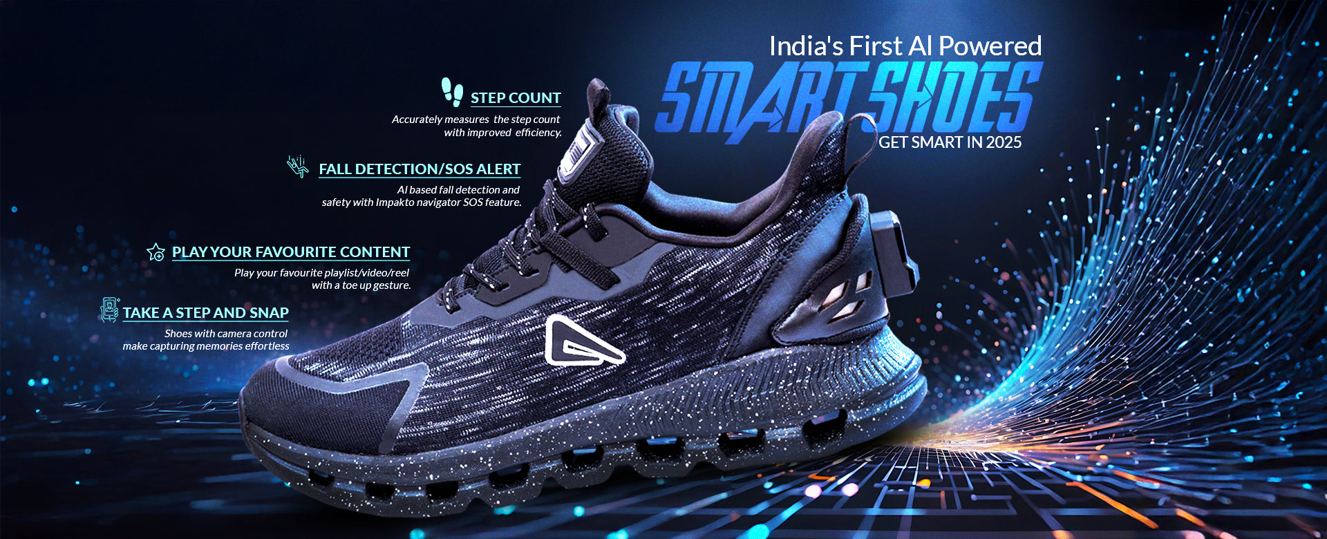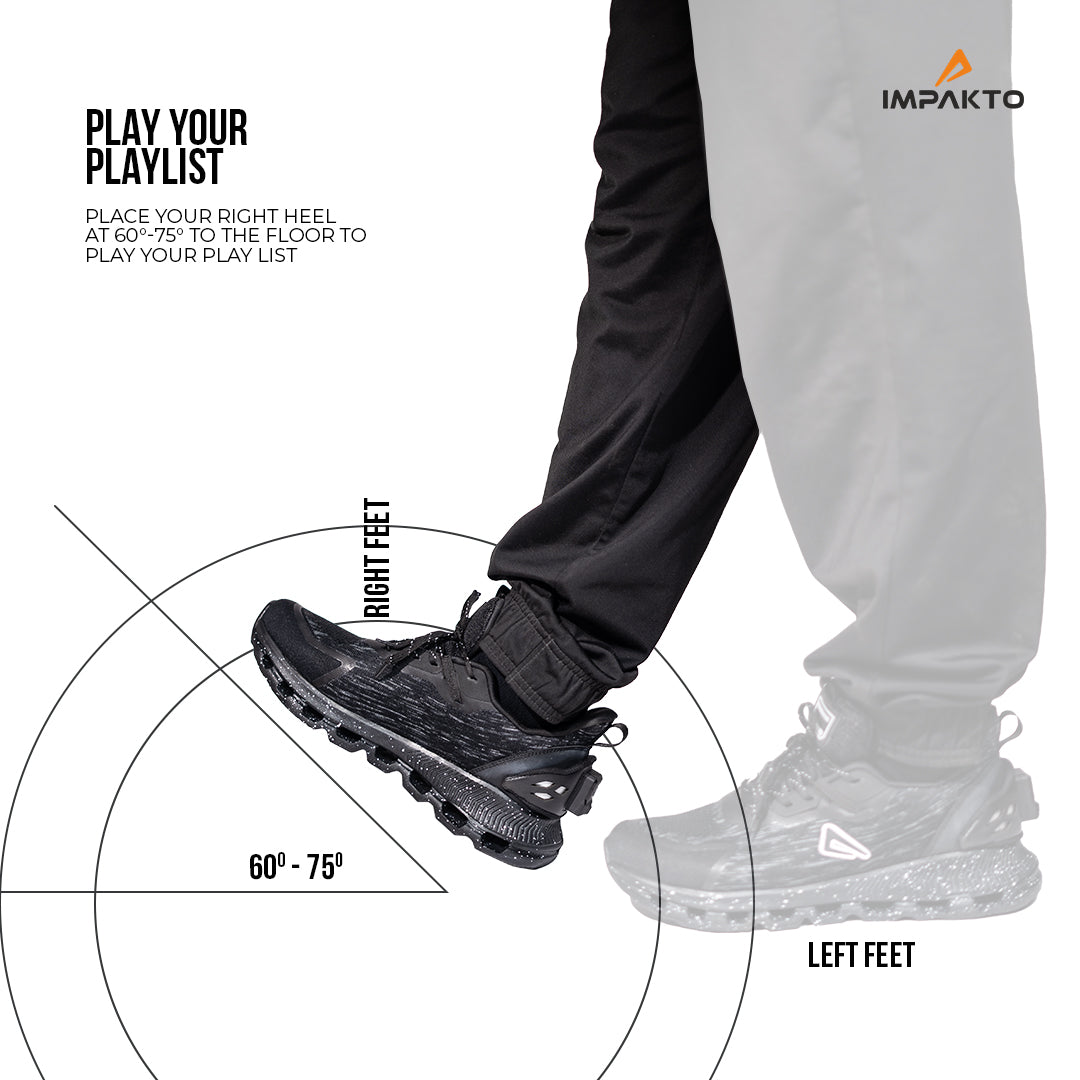 Enjoy your favourite tunes on the go with Impakto's 'Play Your Playlist' feature. Simply place your right heel at a 60-75 degree angle to the floor to start your playlist. Stay motivated and energized during workouts with seamless music control. Whether you're jogging, cycling, or enjoying a leisurely walk, Impakto smart shoes allow you to manage your playlist effortlessly.