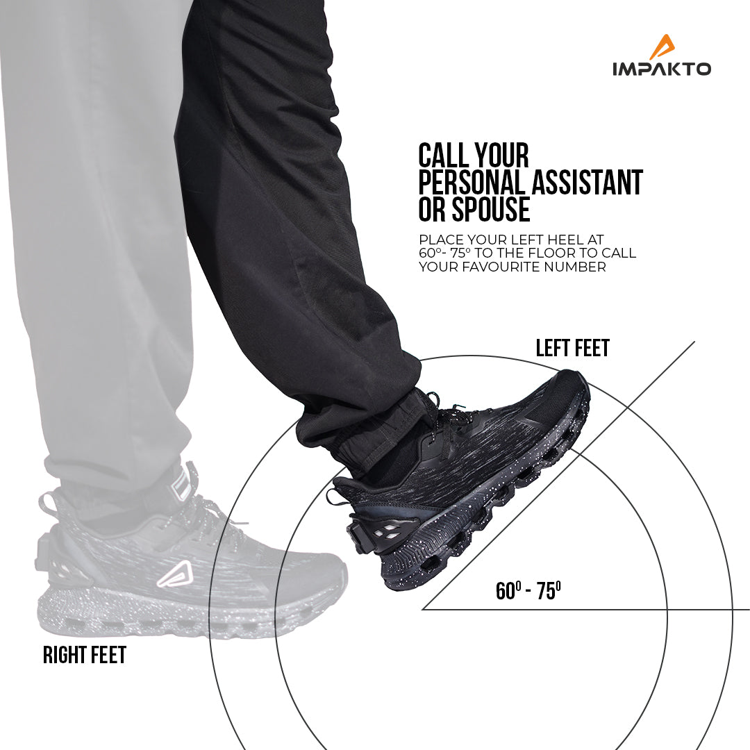 Stay connected with Impakto's smart features. Need to call your personal assistant or spouse? Simply place your left heel at a 60-75-degree angle to the floor to dial your favourite number. Enjoy hands-free convenience and stay in touch effortlessly. Whether you need assistance or want to connect with loved ones, Impakto ensures you're just a heel tap away.